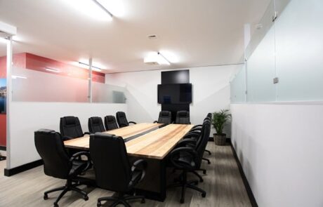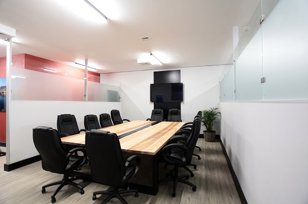- Boardroom area with custom made connectivity ready Blackwood boardroom table, furniture and wall-mounted TV.