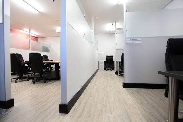 - Open plan cubicles with desktops, connectivity and furniture.