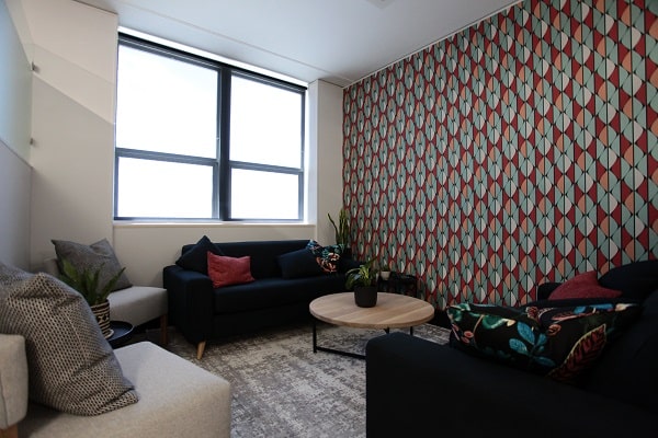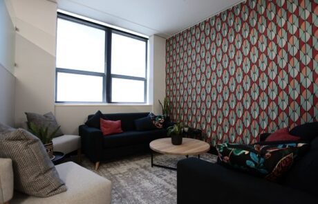 - Lounge area with wall paper, custom made furniture, blinds, pots & plants.
