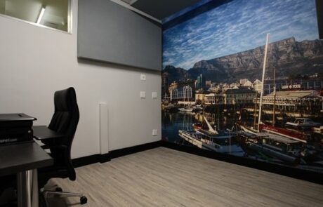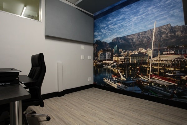 - Sound proof studio with custom made furniture and an iconic image wallpaper background for virtual meetings & training.